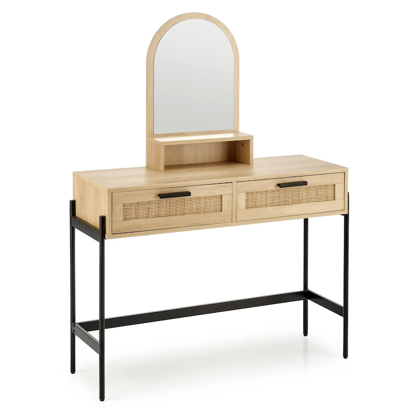 Stůl je vybaven dvěma zásuvkami a zrcadlem.