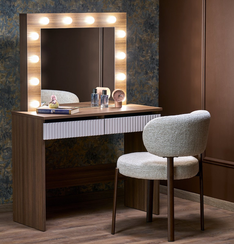 Stůl je vybaven dvěma zásuvkami, zrcadlem a stylovým osvětlením s LED žárovkami.